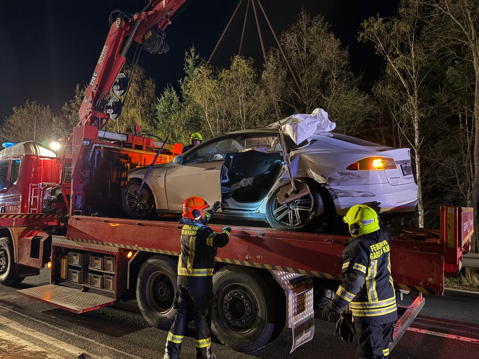 Das Fahrzeug wurde anschließend in einem Container gesichert abgestellt. Aufgrund der bestehenden Brandgefahr kann dieser im Bedarfsfall rasch mit Wasser befüllt werden.