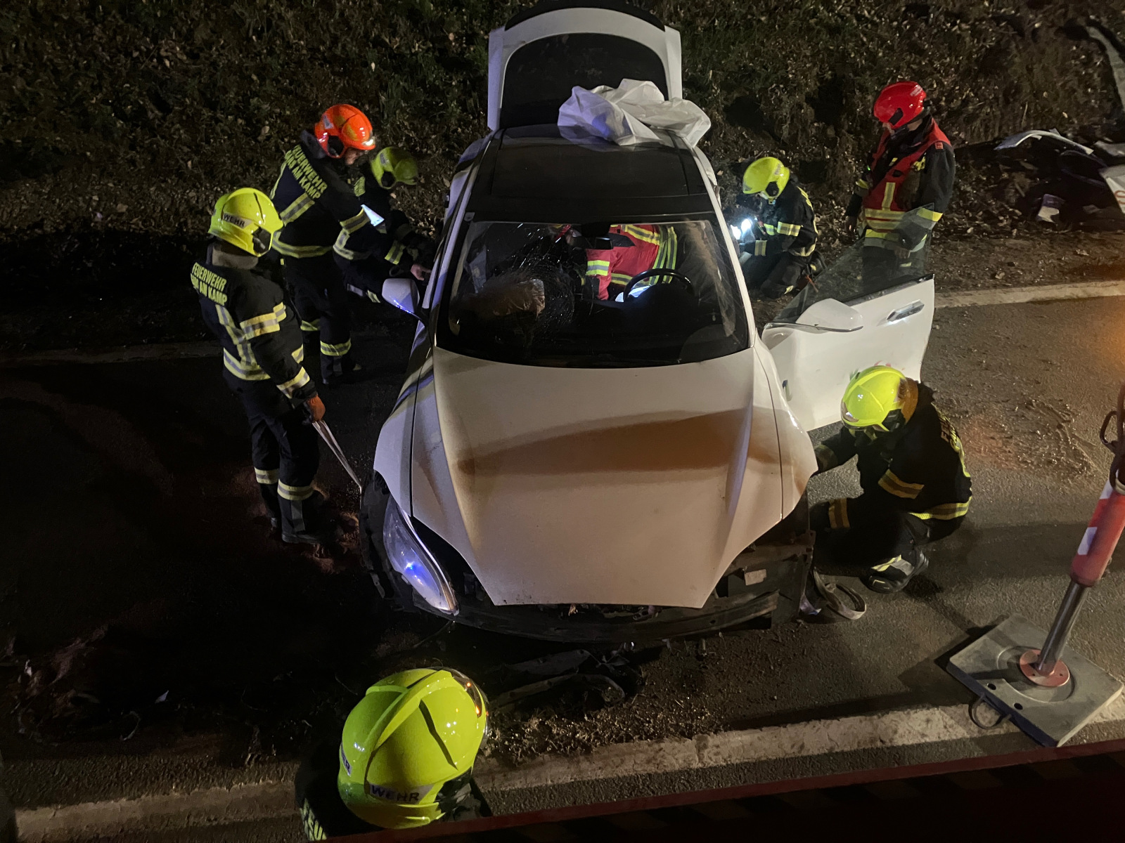 Nach dem Eintreffen der Kameraden aus Harmannsdorf und Matzelsdorf wurde der Rettungsdienst bei der Versorgung des Lenkers unterstützt. Der Einsatzleiter alarmierte zur Bergung des alternativ angetriebenen Fahrzeugs das Wechselladefahrzeug der FF Gars am Kamp.
