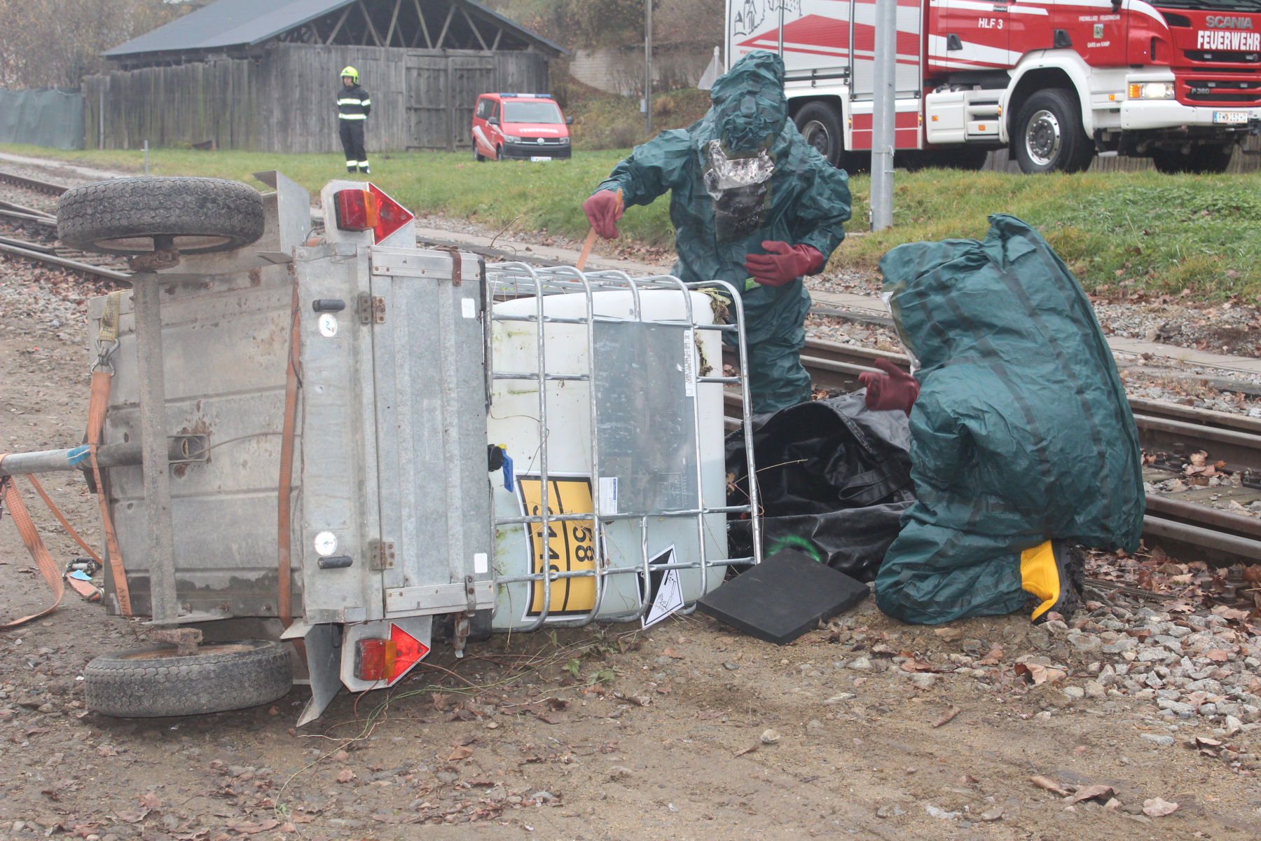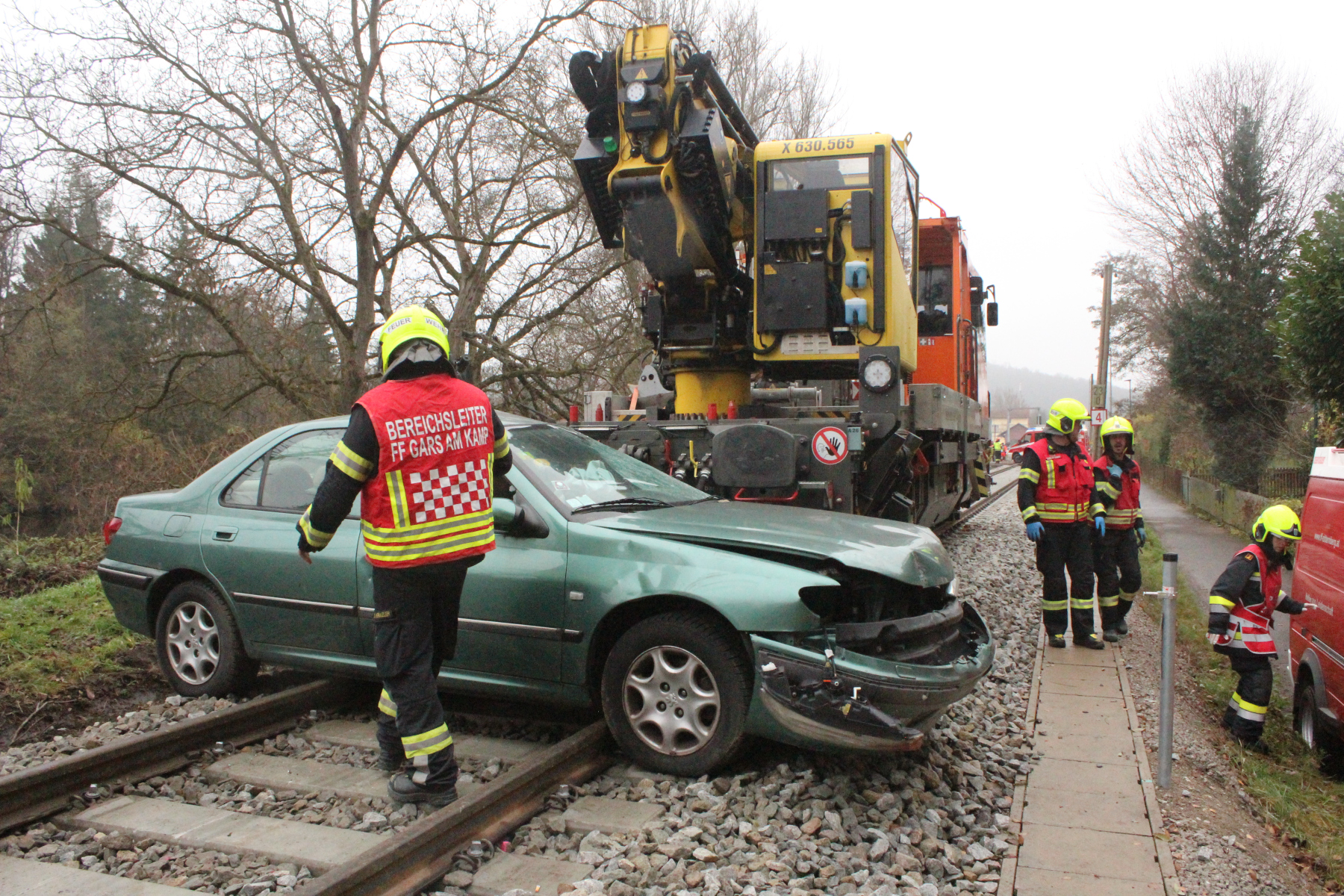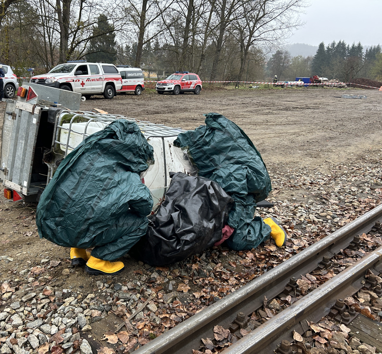 Ein PKW wurde vom Zug erfasst, 50 Meter mitgeschleift und blieb verkeilt am Gleis stehen. Drei Personen waren darin schwer eingeklemmt. Ein zweites Fahrzeug wurde samt Anhänger in das angrenzende Gelände geschleudert. Der PKW kam seitlich zum Liegen, eine Person war darin eingeklemmt. Der mitgeführte Anhänger transportierte einen IBC-Tank mit Peressigsäure (ADR 3149, Klasse 5.1). Der Behälter wurde beschädigt, wodurch ein Gefahrstoffaustritt entstand. Auch der Triebfahrzeugführer und ein Arbeiter des Bauzuges erlitten Verletzungen unbekannten Grades. Die Lage stellte eine intensive Kombination aus Menschenrettung, Technischer Hilfeleistung, Schadstoffeinsatz und Koordination im Gleisbereich dar.